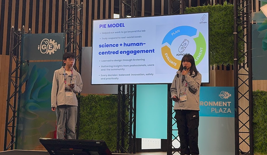 團隊致力解決兩種在水中常見的藥物污染問題,包括四環素(tetracyclines)和水楊酸鹽(salicylates)。透過結合合成生物技術與AI偵察,開發出低成本、高效能的「Remedix」,用於檢測及降解這兩種在水中的藥物污染,從而保障公眾健康及環境安全。團隊利用合成生物技術改良大腸桿菌,成功研製能夠識別四環素和水楊酸鹽並產生色蛋白(chromoproteins)信號的大腸桿菌,透過顏色變化及強度判斷藥物污染物的類別和濃度。大腸桿菌亦能透過多種降解酶:TetX 和 NahG 及 XylE 分別有效地分解四環素和水楊酸鹽。
